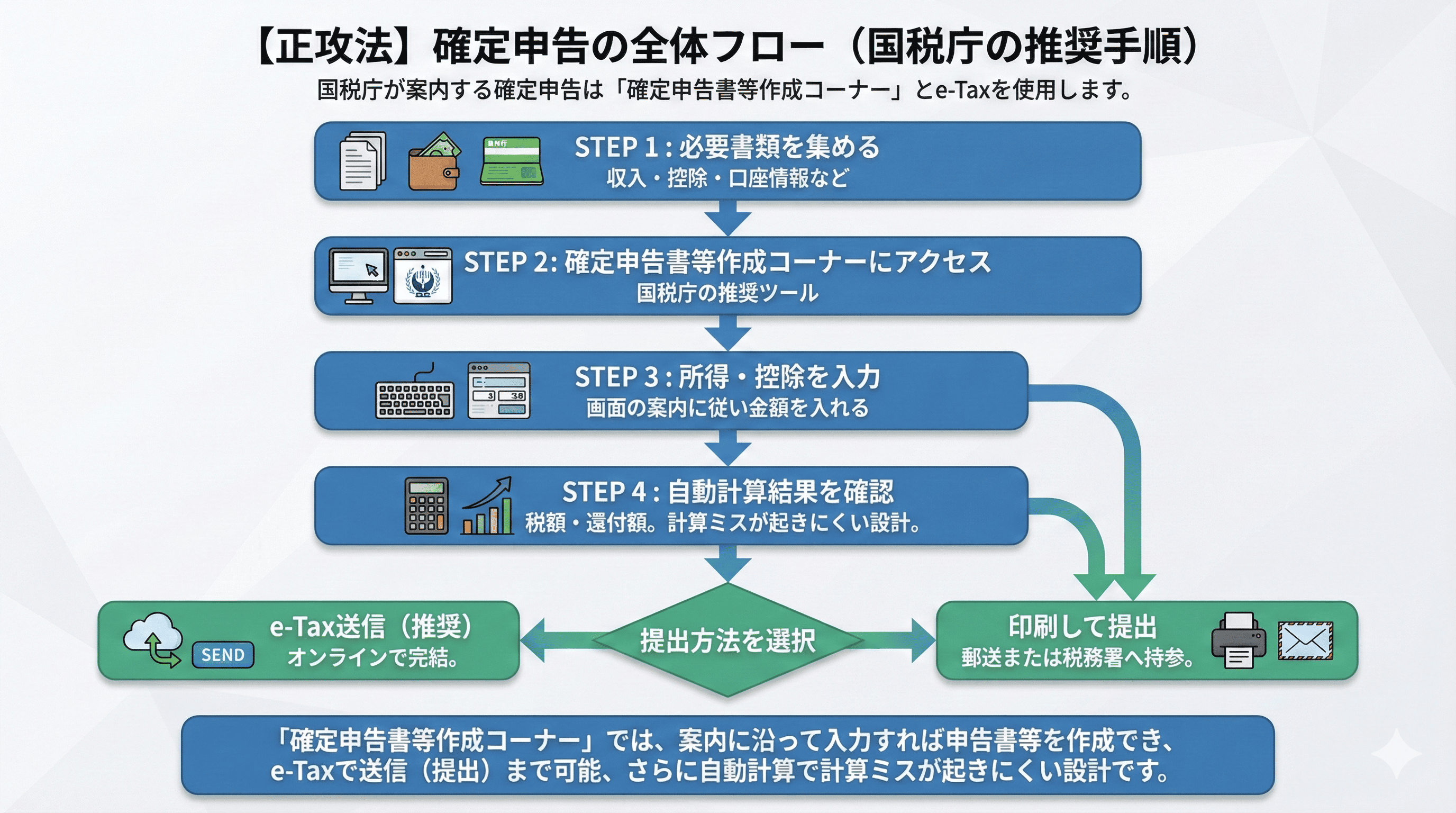 ここを乗り越えるコツは、先に全体像を把握することです。次の章で、国税庁が想定する正攻法の流れを、そのまま分解してわかりやすく解説します。